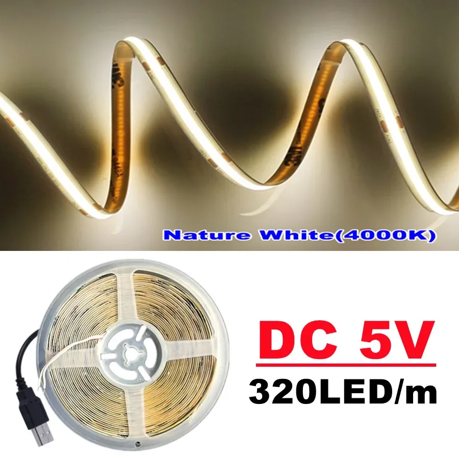 DC 5V USB COB Led Strip Light USB powered High Density Linear Lighting Flexible LED strip 3000K/4500K/6500K Colors 320LED/m