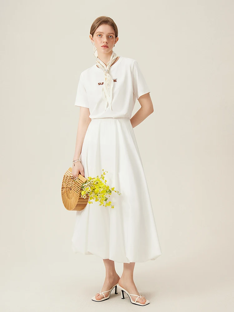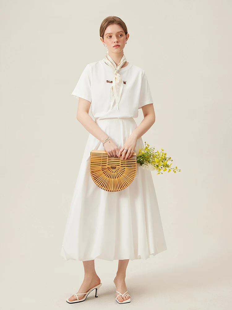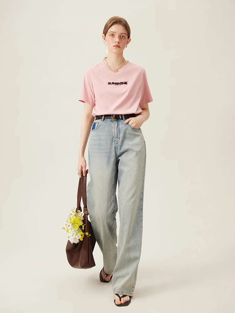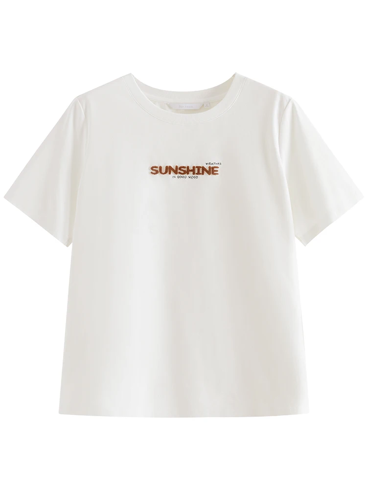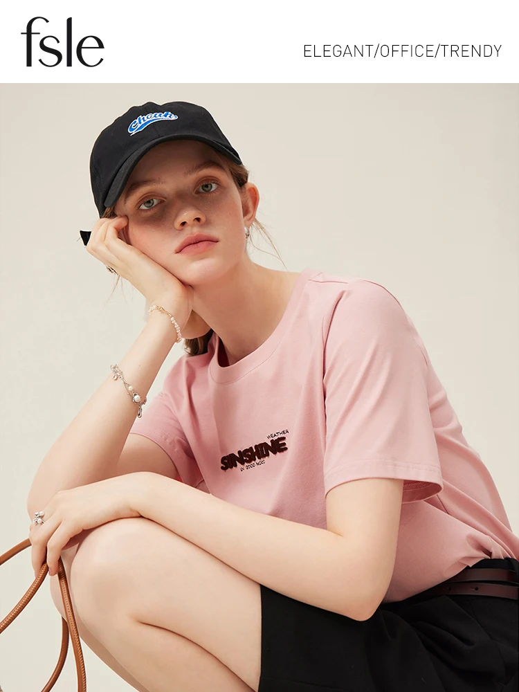 FSLE 69.8% Cotton Women Round Neck Front Shoulder Tees Letter Toothbrush Embroidered Ladies Pink T-shirts White Tops 24FS11355