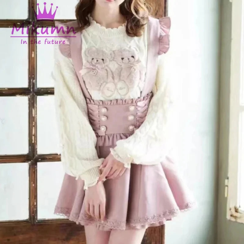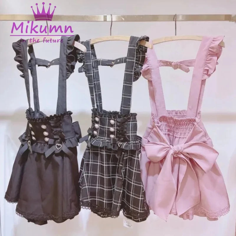 Mikumn Gothic Lolita Retro Bow Pearl Buckle Ruffles Suspender Skirts Y2k Japanese Girls Sweet Kawaii Lace A-Line Mini Skirts