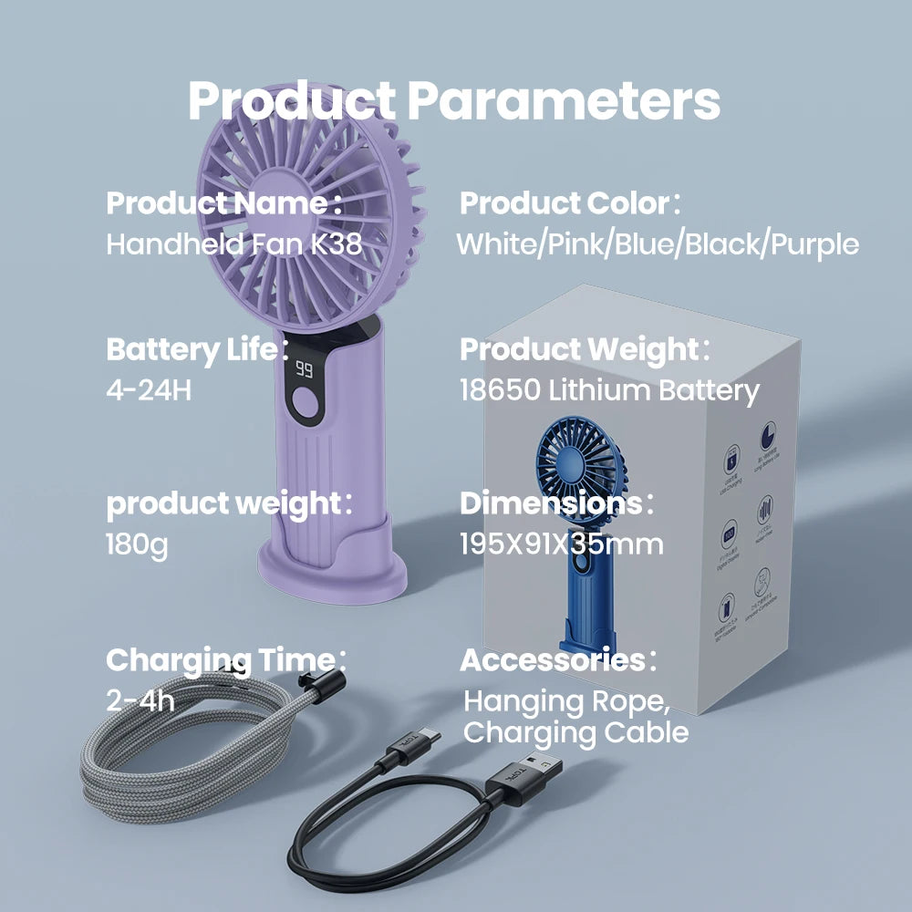 TOPK Portable Handheld Fan 5000mAh USB Rechargeable Foldable Fan 3 in 1 Personal Travel Fan with Digital Display Desk Fan